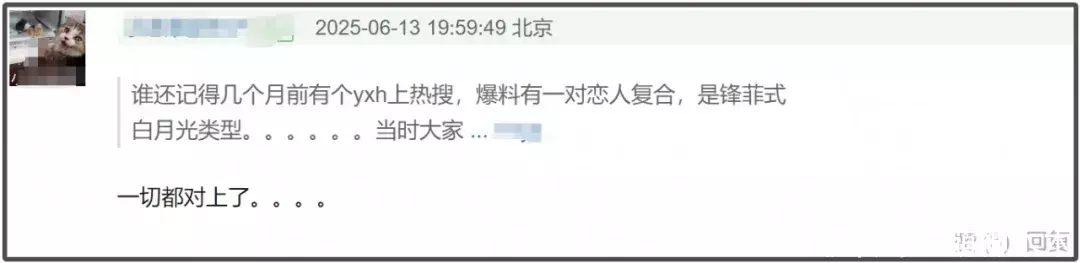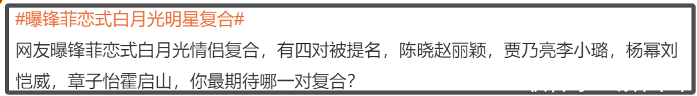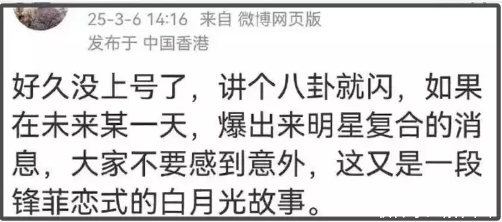 值得一提的是,前段时间曾有网友爆料称“如果在未来某一天,爆出来明星复合的消息,大家不要感到意外,这又是一段锋菲式的白月光故事”,暗示有明星情侣复合了。